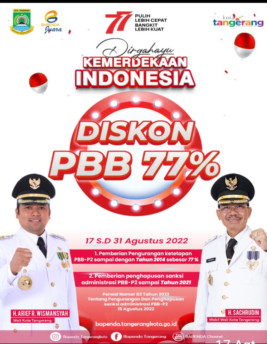 Bahwa mulai Hari Senin, Tgl. 22 Agustus s.d Hari Jumat, Tgl. 30 September 2022 pembayaran PBB dapat dilakukan di Kantor Kecamatan mulai Pukul 08.00 Wib s.d Pukul 14.00 Wib, dalam rangka memperingati HUT RI ke-77 dan untuk meningkatkan pendapatan asli daerah melalui pembayaran PBB P2, maka dengan ini disampaikan Program dari Pemkot Tangerang melalui Badan Pendapatan Daerah (Bapenda), yang dilaksanakan Dari Tgl. 17 Agustus 2022 s.d 31 Agustus 2022, Sbb :